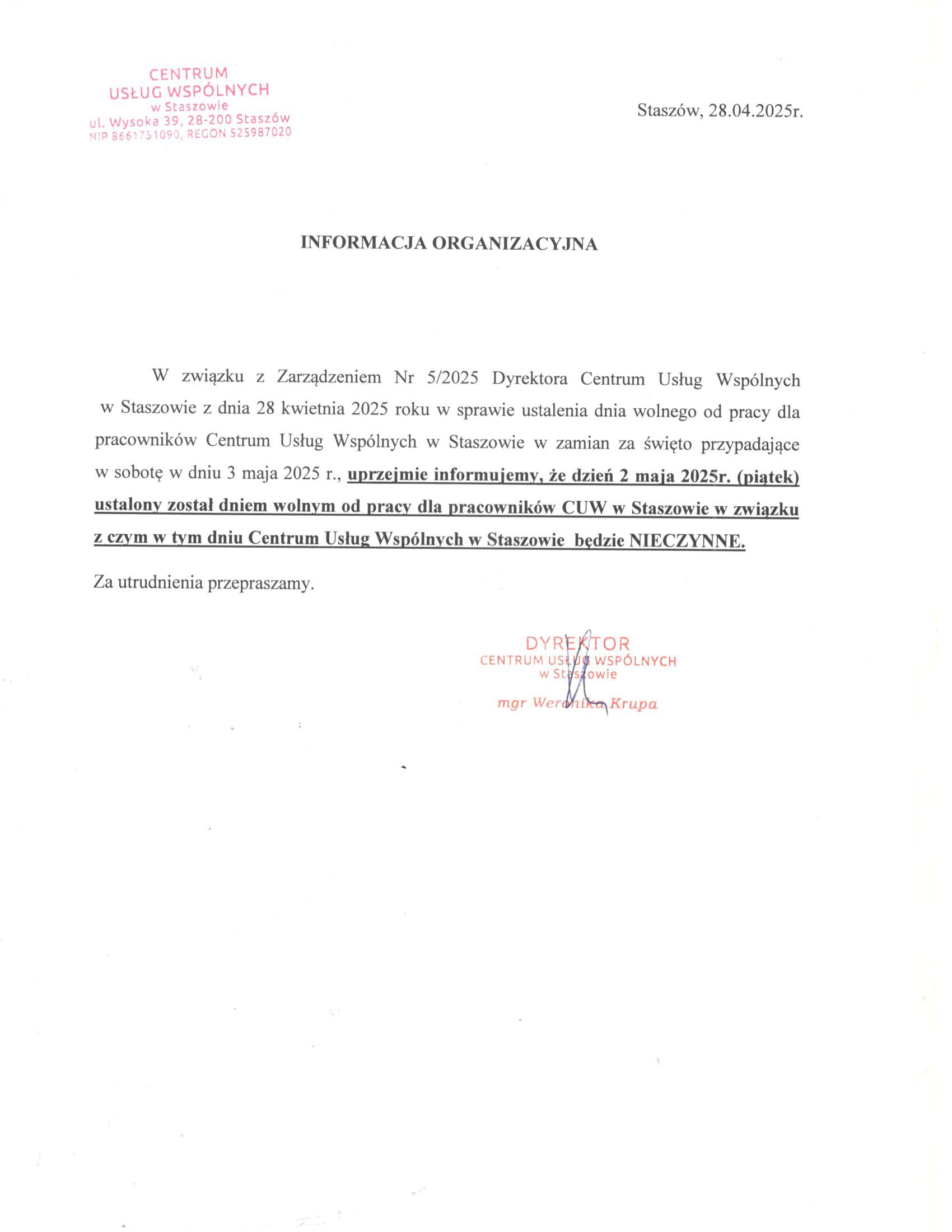 Informacja o dniu wolnym 2.05.2025 r.